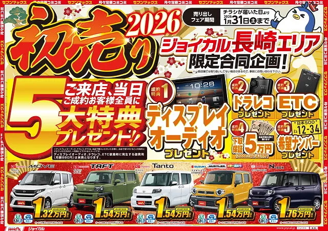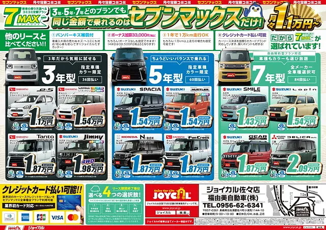 新車販売では、スズキ副代理店、ダイハツピットテンとしての実績を背景に全国542店舗を展開するジョイカルにジョイカル佐々店として加盟致しております。