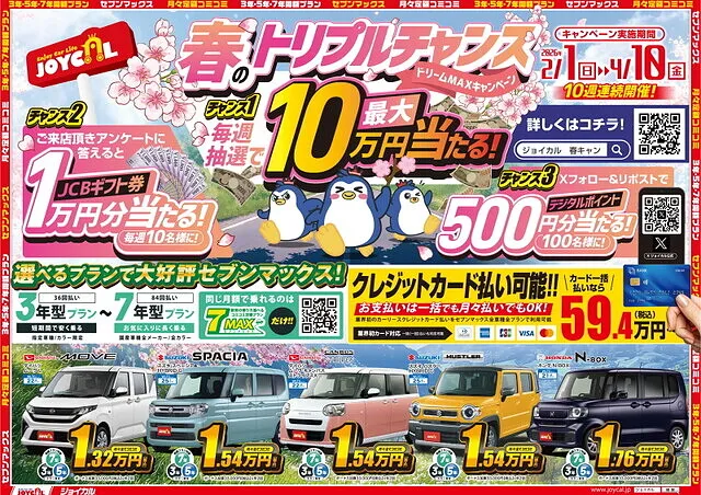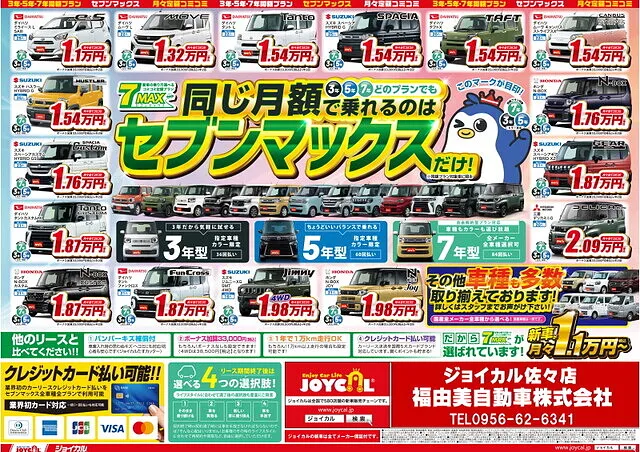 新車販売では、スズキ副代理店、ダイハツピットテンとしての実績を背景に全国542店舗を展開するジョイカルにジョイカル佐々店として加盟致しております。
